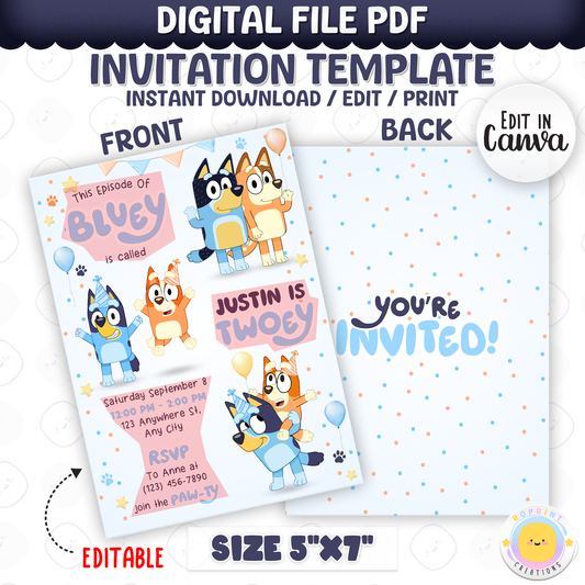 Bluey TWO-EY Birthday Invitation - Bluey Editable Kids 2nd Birthday Invite