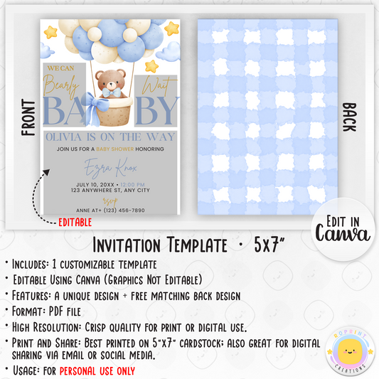 We Can Bearly Wait Baby Shower Invitation - Bear Baby Shower Blue Invite