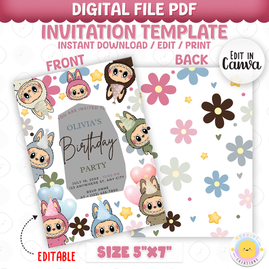 Labubu Daisy Birthday Invitation - Editable Party Invite Template