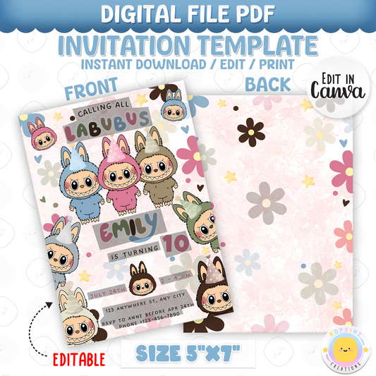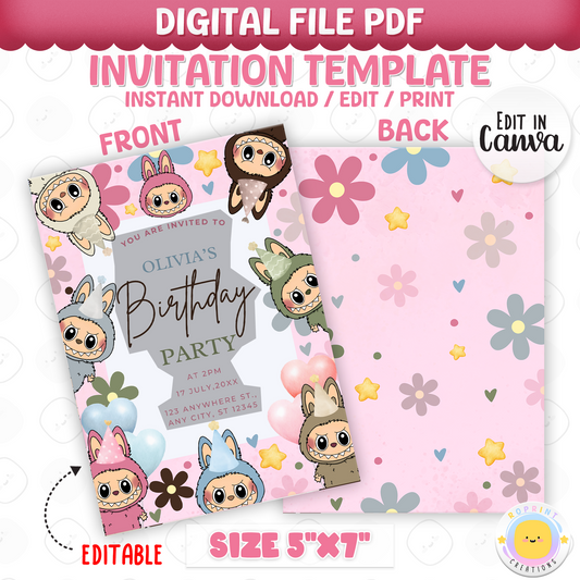 • Celebrate with this cute pink Labubu daisy themed invitation. Fully editable in Canva - print at home or share digitally in minutes. Instant download.