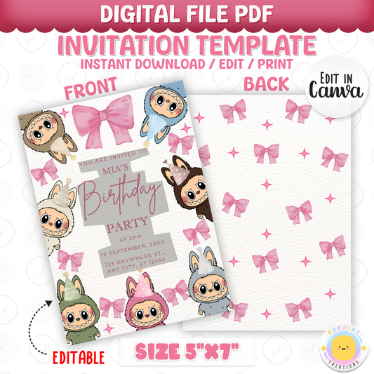 Editable Labubu Birthday Invite - Labubu Coquette Invitation Canva Template - Instant Download