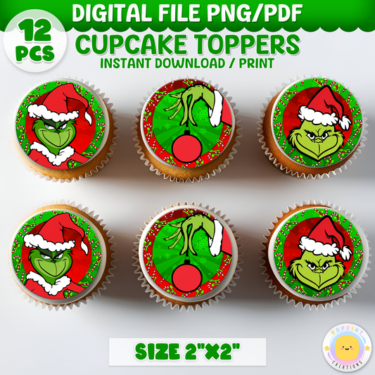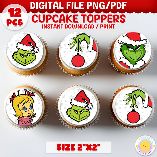 Grinch Cupcake Toppers - Grinch Snowflake Christmas Party Favor Printable