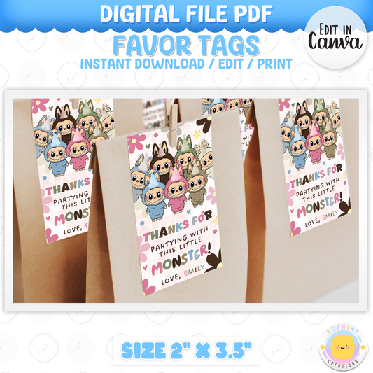 Labubu Inspired Daisy Birthday Favor Tags - Cute Labubu Kids Editable Thank You Tag Party Favor