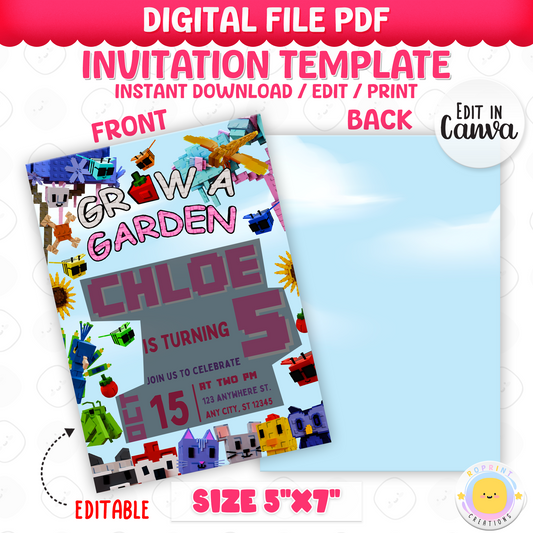 Roblox Grow A Garden Girl Party Invitation - Editable Canva Template