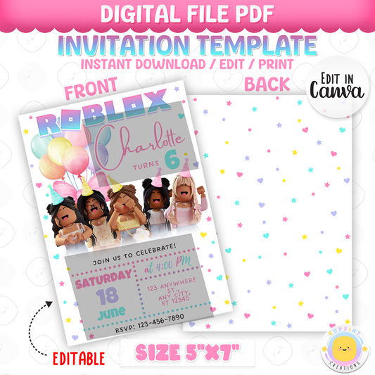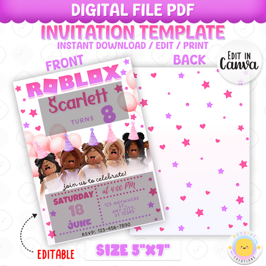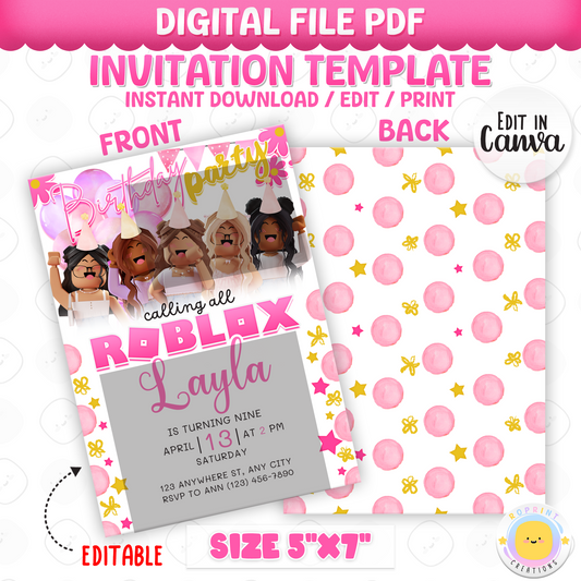 Roblox Girl Birthday Invitation Template - Roblox Girl Editable Invitation